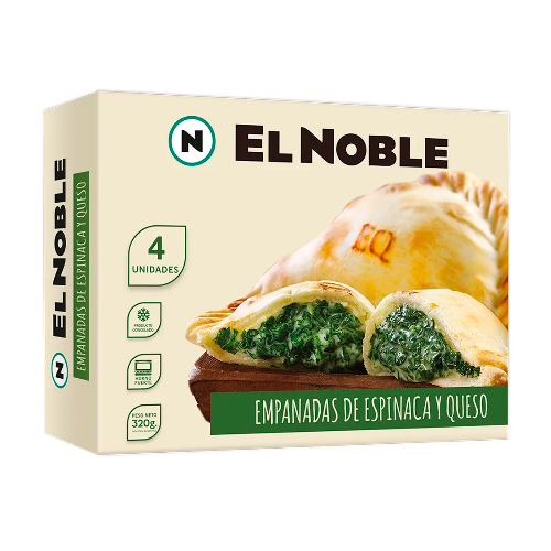 Empanadas congeladas de Espinaca y Queso. Masa tipo Criolla que puede ser cocida tanto al horno como en freidora. Presentación:Caja de 4 unidades.