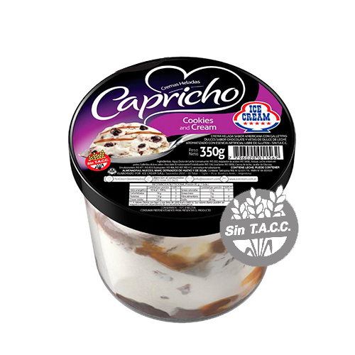 Crema helada sabor americana con galletitas dulces sabor chocolate y vetas de dulce de leche aromatizado con esencia artificial. Libre de gluten – Sin T.A.C.C. Presentación: – Pote x 350 grs. – Caja con 6 potes