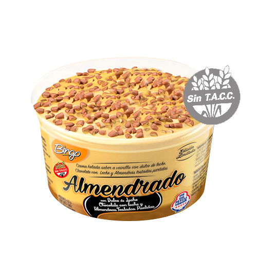 Crema Helada Sabor a Vainilla con Dulce de Leche, Chocolate con Leche y Almendras Tostadas Partidas. Sin TACC Presentación: – Envase de 105 grs. – Caja x 12 unidades.