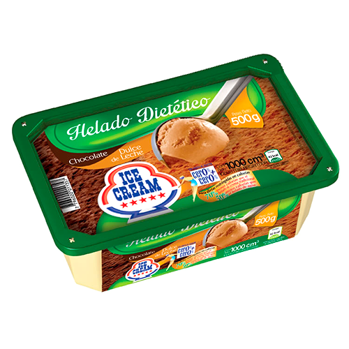 Helado de agua dietético de chocolate y sabor dulce de leche reducido en calorías y bajo valor glucídico.