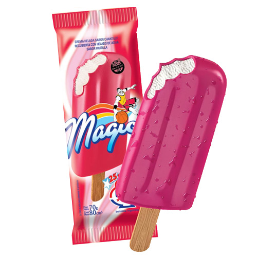 Crema Helada sabor Chantilly recubierta con Helado de Agua sabor Frutilla.