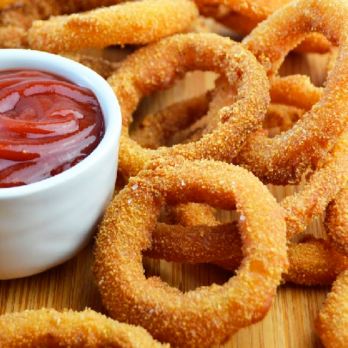 Aros de cebolla triturada, empanados, prefritos y ultracongelados. Rápidos de preparar y fácil racionado. Un producto muy versátil: un básico en todos tus combos, como producto para dippear o como parte de tus hamburguesas. Pack x 1 kg.