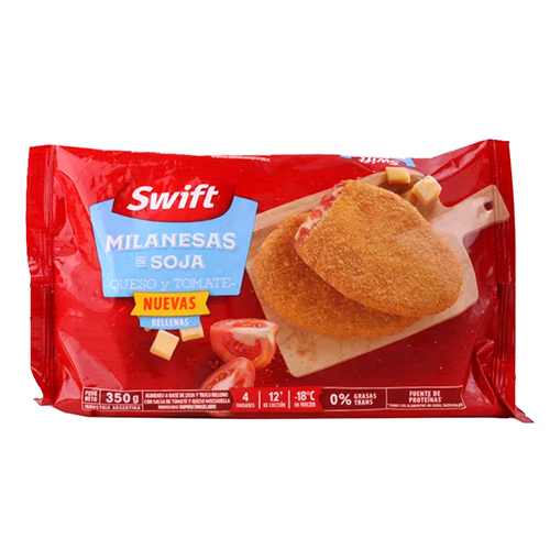 Milanesas de soja rellenas con tomate y queso. Son naturales y no prefritas. 0% grasas trans, fuente de proteínas y fibras y libres de colesterol. Presentación: Caja x 4 unidades de 95 g.